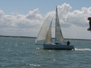 Our latest 6 metre design draws on experience gained from the various versions of our 550 design and the earlier 6 meter design “Hot tramp” owned by Ross Hutchins in south Australia but this one is being set up for kit set construction.It is multi-chined with 4 panels per side, epoxy sheathed externally. She is maximum trailerable beam at 2.5 metres which is carried all the way to the stern. The centreboard is ballasted and foiled, pivoting up flush with the bottom of the hull.The cabin runs full width as per my 550 and 650 designs giving plenty of internal space. The wide beam and freeboard result in a large volumed boat with a habitable interior.