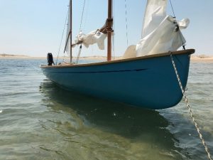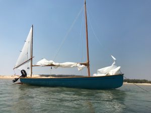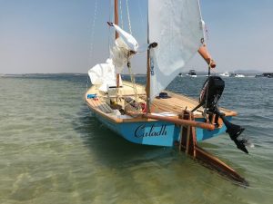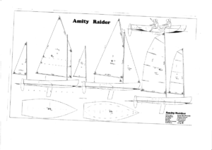 The Amity raider was designed for Mr. Euan MacDonald of Brisbane. Euan instigated the designing and building of the larger Amity 22 traditionally styled production boat and was after something smaller, easily handled, to participate in coastal and inshore “Raid’ events. These are often run up rivers and estuarys to local pubs and allow for the boats to be sailed and/or rowed. The specification he gave was for a traditionally styled boat that could be rowed or sailed either single handed or with crew. By necessity it needed to have low freeboard to be able to be rowed efficiently. I drew up several rig option, Euan choosing the Gunter-yawl rig for the first boat “Caladh”. I’d also drawn up a cat-ketch rig with twin windsurfer masts, a gaff/ketch and a sloop rig. The boat has s simple flat plate aluminium swing up centreboard and rudder.